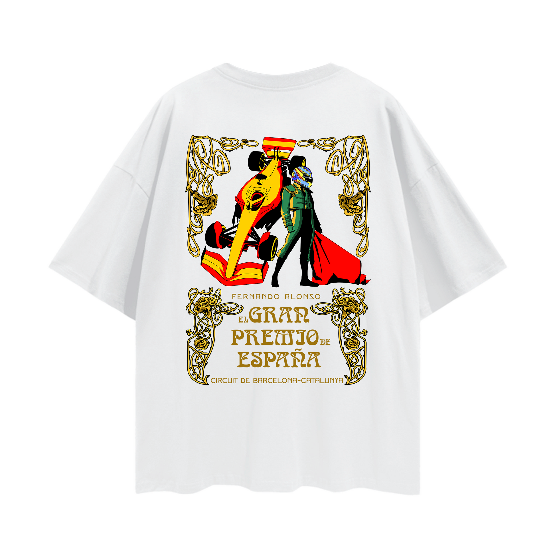 For our Matador Alonso shirt, we've dressed Nando in a traje de luces and recast him as a traditional torero! Rounded out with an art deco motif and a car liveried in the colors of Spain, this hand-illustrated Spanish Grand Prix tee is a true work of art.